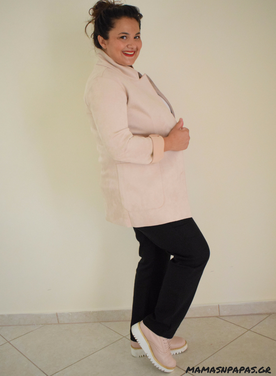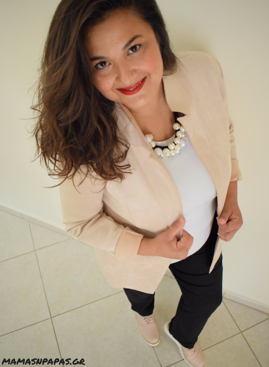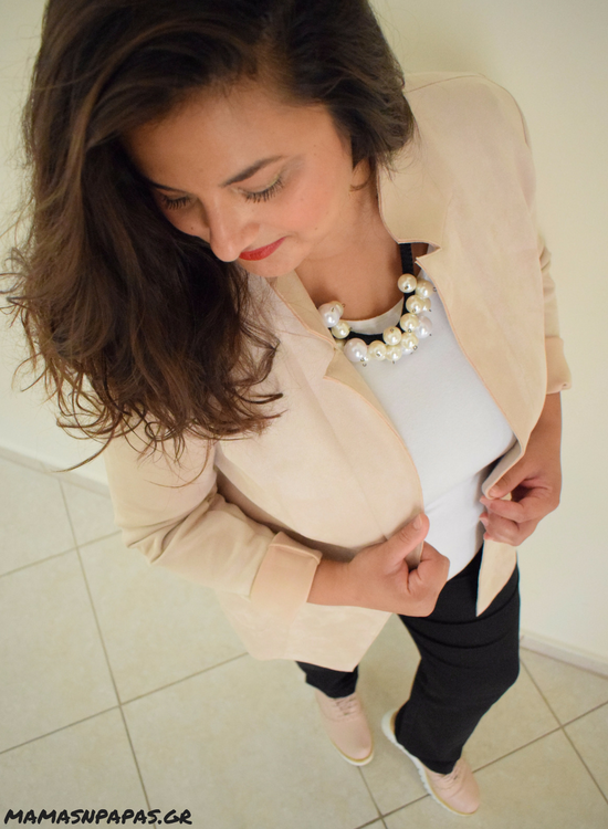 Για το τέλος, σου επιφύλαξα ένα suede σακάκι τύπου blazer σε χρώμα nude. Το χρώμα αυτό είναι και πολύ της μόδας και το αγαπώ πολύ εγώ προσωπικά. Το συνδύασα πάλι με ένα μαύρο παντελόνι τύπου ‘chino’ και λευκό μπλουζάκι 3/4 από μέσα! Το παπούτσι ήθελα να είναι ασορτί με το σακάκι οπότε ολοκλήρωσα το look με τα αγαπημένα μου Platform Oxford σε Nude από την εταιρεία Sante! Ένα statement με μεγάλες πέρλες, τύπου μαργαριτάρι, νομίζω πως έδωσαν στο ντύσιμο μία πιο glamorous πινελιά! Είναι σίγουρα ένα casual evening outfit!