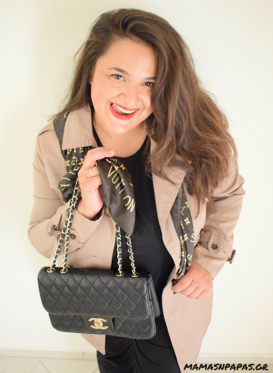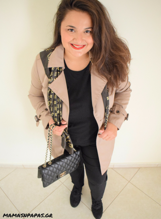 Αυτό το look είναι από τα αγαπημένα μου μπορώ να σου πω, το σχεδόν total black! Ένα μαύρο παντελόνι τύπου ‘chino’ σίγουρα έχεις στην ντουλάπα σου και αν όχι πρέπει σίγουρα να αγοράσεις κάποια στιγμή!Το όλο μαύρο στυλ το αγαπώ, γιατί νομίζω πως κόβει πολύ εμάς με τα extra παχάκια!Για top επέλεξα ένα μαύρο T-shirt χωρίς τίποτα επάνω και για πανωφόρι την καμπαρντίνα μου σε μπεζ απόχρωση! Παπούτσι μαύρο oxford και τσάντα μαύρη με χρυσές λεπτομέρειες που ταιριάζουν με το φουλάρι που επέλεξα να στολίσει τον λαιμό μου, μιας και δεν σηκώνει αξεσουάρ το συγκεκριμένο πιστεύω! Αυτό το σύνολο είναι σίγουρα πιο επίσημο, ίσως για ένα χαλαρό κρασάκι το βράδυ, για κάποια εκδήλωση- γιορτή με τα παιδιά ή κάποιο cocktail party!