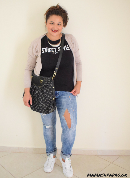 Αγαπώ να συνδυάζω το jean με το μαύρο γιατί νομίζω πως ταιριάζουν απόλυτα! Μια loosy ζακέτα ανοιχτόχρωμη και το αγαπημένο μου Adidas StanSmith ολοκλήρωσαν το look της ημέρας! Για τσάντα επέλεξα την αγαπημένη μου jean σε στυλ ταχυδρόμου που χωρά απίστευτα πολλά πράγματα μέσα. Όλα εκείνα που πρέπει να κουβαλάει συνήθως μία μαμά όταν πηγαίνει βόλτα με το παιδί αλλά και μία γυναίκα. Τέλος, ένα statement στο λαιμό είναι πάντα καλή επιλογή!