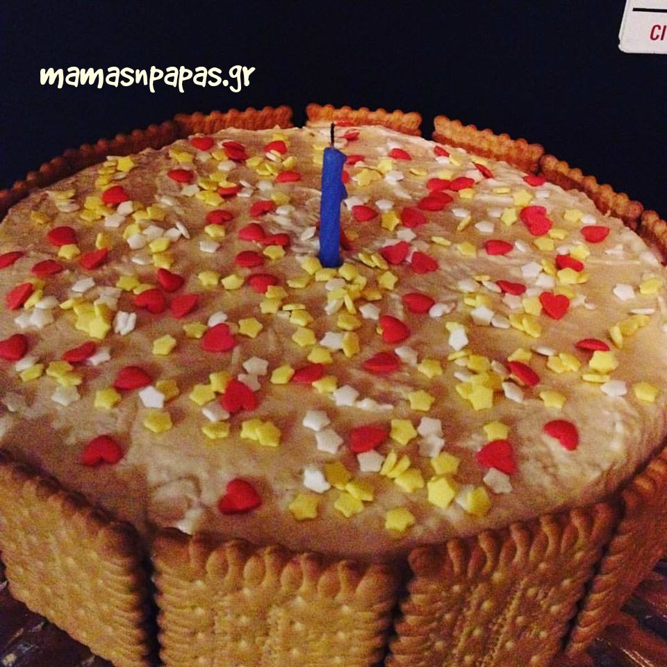 Αυτήν τη φορά λοιπόν επέλεξα να την διακοσμήσω με μπισκότα πτι-μπερ τριγύρω που δεν λείπουν ποτέ από τα κουτιά με τα μπισκότα μας, μιας και τα αγοράζουμε τρία-τρία, και από πάνω πασπάλισα με 2 ειδών κας κας που είχα αποθηκευμένα από την γιορτή των ερωτευμένων..Καρδούλες και αστεράκια λοιπόν για τον μπαμπά μας, γιατί αξίζει πολλά και ας μην του το δείχνουμε καμιά φορά!!(έχει και αυτός τα παράπονά του, τι να κάνουμε!)..