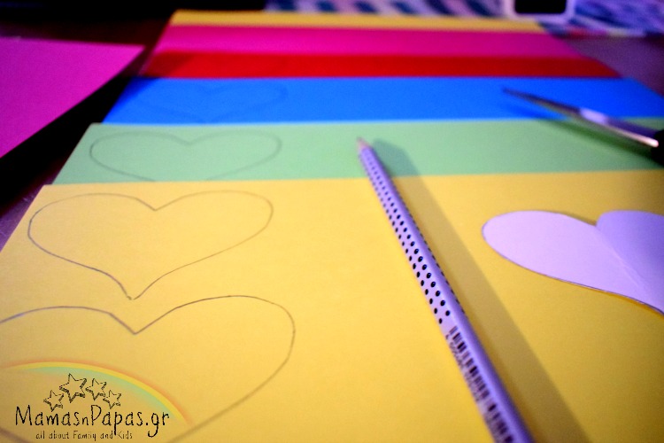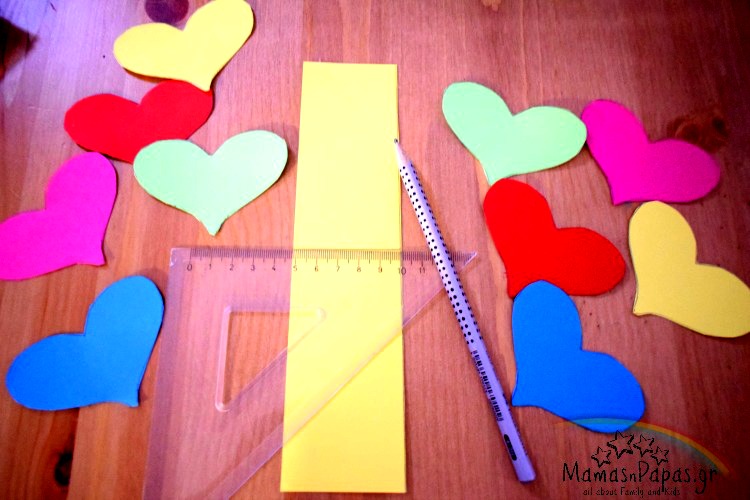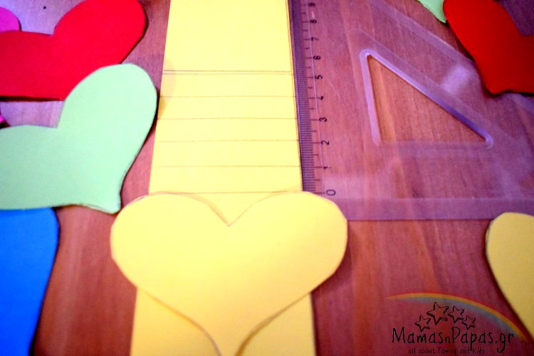 Ξεκινάς σχηματίζοντας καρδούλες σε όλα τα χρώματα που διάλεξες και έπειτα τις κόβεις!Στην συνέχεια κόβεις μια λωρίδα 5 εκατοστών στο πλάτος σε όποιο χρώμα θέλεις ώστε να κολλήσεις εκεί πάνω αργότερα τις καρδιές που έκοψες!Τοποθετείς την πρώτη καρδιά στο κάτω μέρος της λωρίδας και από πάνω της τραβάς μία γραμμή με το χάρακα! Έπειτα με την βοήθειά του (χάρακα) σχηματίζεις μια γραμμή ανά ένα εκατοστό προς τα επάνω! Τσακίζεις την κάθε γραμμή που χάραξες ανά εκατοστό και έπειτα ισιώνεις την λωρίδα σου ξανά! Κολλάς την πρώτη σου καρδιά στην πρώτη γραμμή από το τέλος και έπειτα τις επόμενες σε κάθε μία γραμμή που έχεις τσακίσει καλά!