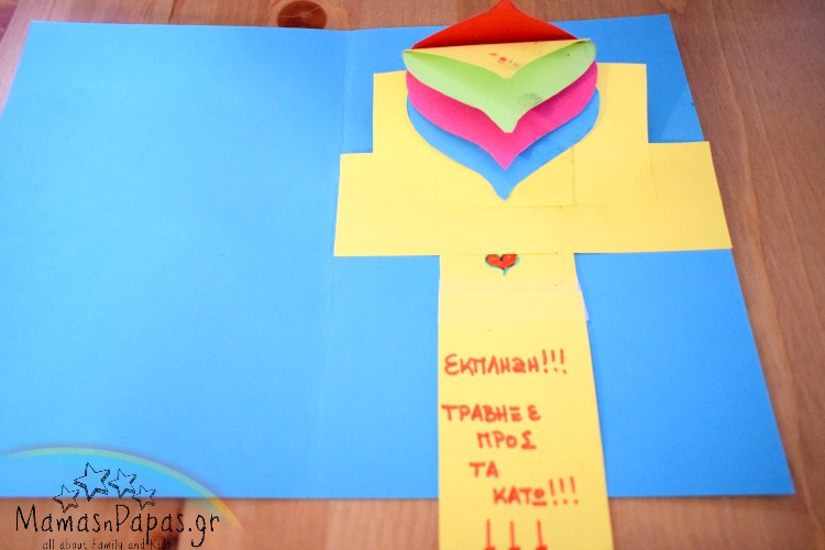 Στο κάτω μέρος που προεξέχει έγραψα αυτό που βλέπεις στην εικόνα ↑↑↑! Αν τραβήξεις αυτή την λωρίδα λοιπόν, οι καρδούλες θα διπλωθούν κάτω από την λωρίδα που κολλήσαμε στην μέση του χαρτιού! Τραβώντας προς τα κάτω και καθώς αυτές θα κρύβονται από πίσω, θα ξεπροβάλει το μήνυμα – αφιέρωση με τις ευχές για χαρούμενα γενέθλια! Εννοείται πως μπορείς να προσαρμόσεις το μήνυμα ανάλογα με την γιορτή κάθε φορά! Μπορεί να προορίζεις την κάρτα για την φίλη σου, την μαμά σου, την γιαγιά ή όποιον άλλον θέλεις!Επίσης, μπορείς αντί για καρδιές να κόψεις αστεράκια, συννεφάκια ή ότι άλλο έχεις στο μυαλό!