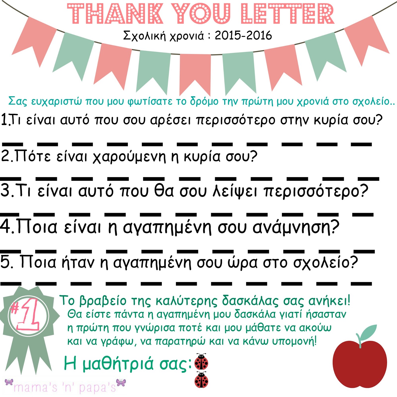 Νομίζω πως ένα τέτοιο σημείωμα είναι κάτι που θα το εκτιμήσει πολύ και σίγουρα θα θέλει να φυλάξει, μιας και το παιδάκι απαντά σε ερωτήσεις σχετικές με την δασκάλα του και σημειώνει εντυπώσεις για την χρονιά που πέρασε! Είναι ένα καλό feedback για την δασκάλα, δεν νομίζεις;