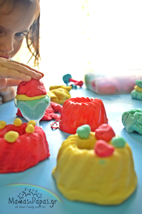 Οι σπιτικές μας πλαστελίνες σήμερα πήραν την μορφή ενός λαχταριστού παγωτού, ενός πολύχρωμου cake με γεύση μπανάνα και φράουλα. Έγιναν φατσούλες και ακουστικά για το nintendo, βραχιόλια, δαχτυλίδια, τούρτες, νομίσματα, κουλουράκια και πολλά πολλά άλλα! Είχαν καιρό να παίξουν με αυτές και νομίζω πως σήμερα ξεπέρασαν τον εαυτό τους! Ήταν τουλάχιστον 2 ώρες μέσα στο δωμάτιο και αυτοσχεδίαζαν!