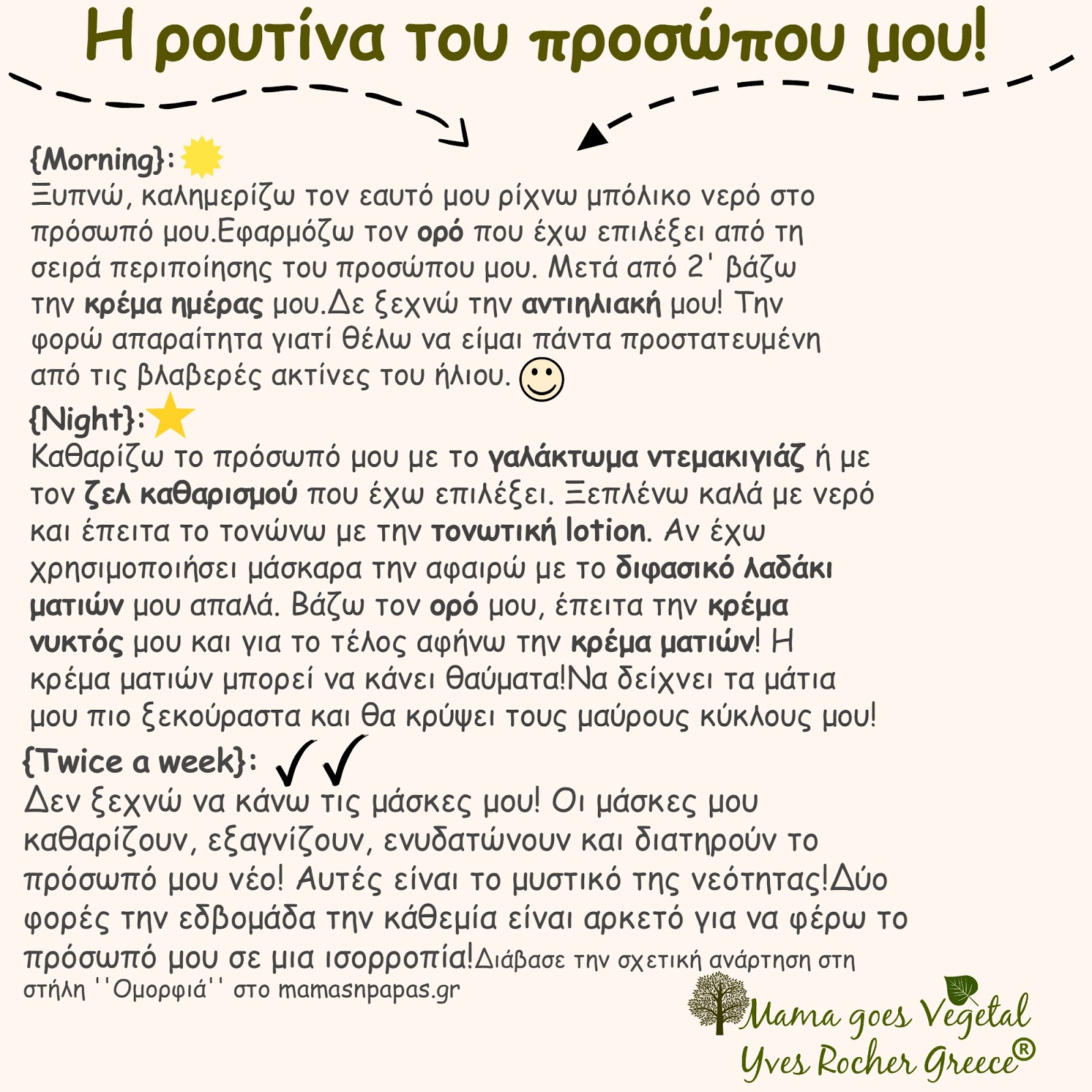 Ελπίζω να σε βοήθησα να οργανωθείς αλλά και να ξεκινήσεις να δημιουργείς και εσύ ελεύθερο χρόνο για την περιποίηση του προσώπου σου! Αν θέλεις να μπεις στην παρέα μας σε προσκαλώ στην ομάδα μου Mama Goes Vegetal και στον κόσμο της Φυτικής Κοσμετολογίας του Yves Rocher και θα σε βοηθήσω να βρεις τα καλύτερα προιόντα για τον τύπο δέρματός σου!