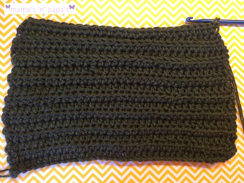 - Γύρος 4ος: Κάνω 2 θηλιές γυρνώ το έργο μου και ξεκινώ double crochet ως το τέλος της σειράς αυτή την φορά, όμως, πιάνοντας μόνο την πίσω κλωστή από τις 2 που βλέπω μπροστά μου. Έτσι όπως κοιτώ την πάνω σειρά βλέπω 2 κλωστές να βρίσκονται επάνω. Πιάνω την πίσω με προσοχή και κάνω double crochet!