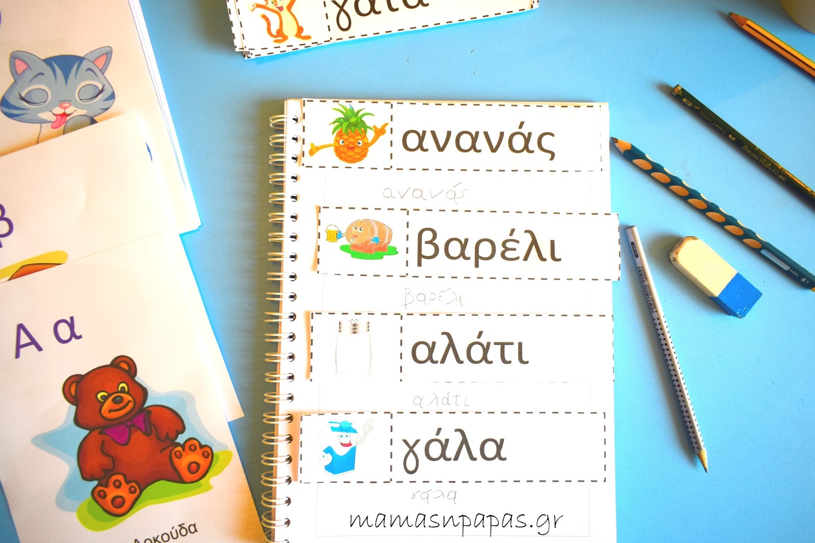 Προσπαθούσα να κάνουμε τον ήχο του κάθε γράμματος, όπως μας έχει υποδείξει η δασκάλα! Δηλαδή το Άλφα δεν το φωνάζουμε με το όνομά του αλλά ως “Α”, το Βήτα ως ”Β” (ούτε βου, σκέτο β), το Γάμα ως ”γ” (‘οχι γου) και πάει λέγοντας! Αφού προσπαθήσαμε να συλλαβίσουμε την κάθε λέξη την γράψαμε με μεγάλη ευκολία στο αγαπημένο του τετράδιο!