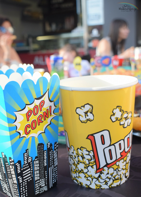 Για το decor του μπουφέ είχα πολλά σχέδια! Εξαιτίας της ανυπόφορης κίνησης που πέτυχα πηγαίνοντας προς το All Day Roma Pizza δεν κατάφερα να στήσω ότι ήθελα όπως το ήθελα! Οι καλεσμένοι μας είχαν αρχίσει να έρχονται και εγώ πολύ απλά σταμάτησα να πειραματίζομαι! Κάποιες από τις φωτογραφίες που θα δεις σε αυτή την ανάρτηση είναι από το χεράκι του Ανθομέλι και την ευχαριστώ πολύ για αυτό! Το πρόβλημά μου βασικά ήταν ότι λόγω ζέστης δεν ήξερα που να στήσω τον μπουφέ μου για αυτό και δεν τον είχα έτοιμο από το πρωί! Του χρόνου θα είμαι ακόμα πιο οργανωμένη! Έφτιαξα 3 κουτιά που να θυμίζουν λιγάκι Gotham City και στόλισα με αυτά τον μπουφέ! Πήρα πολύχρωμα ποτηράκια-πιατάκια-καλαμάκια ώστε να ταιριάζουν με το θέμα. Χαρτοπετσέτες Pow από τα Flying Tiger. θήκες για Pop Corn & Super Heroes Banner από το Happy TeaPot και ένα τραπεζομάντηλο με όλους τους ήρωες της Marvel!