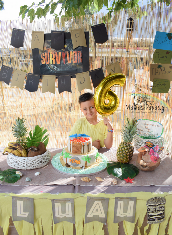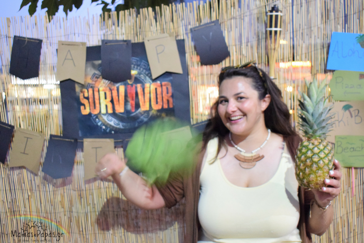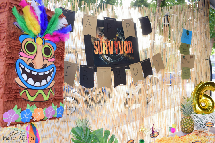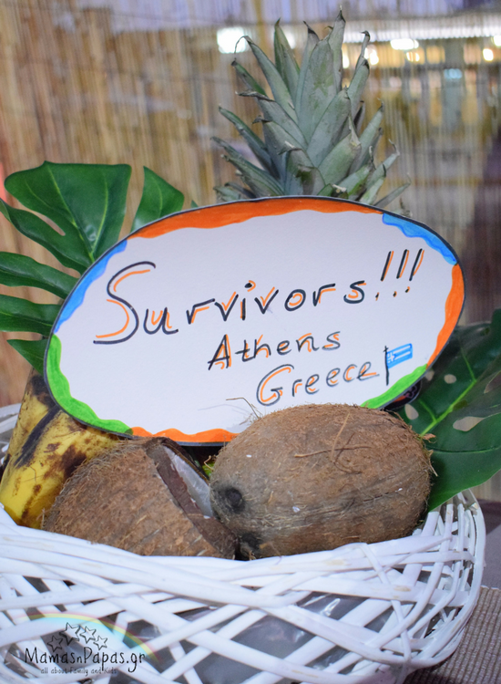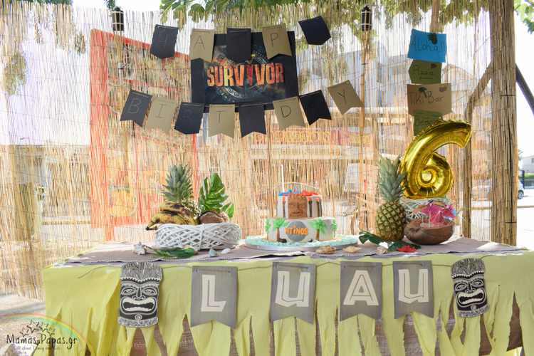 Όπως ίσως διέκρινες εκτύπωσα μια φωτογραφία σε Α3 με το sign του Survivor. Το κόλλησα σε μεγάλο κανσόν μαύρο! Το στερέωσα με tai-raps καθώς επίσης και ένα πολύ πρόχειρο banner με happy birthday πάνω στην καλαμωτή μου! Ετοίμασα διάφορα ταμπελάκια με τα χέρια μου, σαν photo props. Ένα ακόμη banner Luau και τέλος ένα sign με πινακίδες σχετικές! Στην καλαμωτή μου είχα δύο δάδες στερεωμένες, τις οποίες βέβαια δεν άναψα διότι φοβήθηκα μην πάρουμε φωτιά λόγω αφόρητης ζέστης!