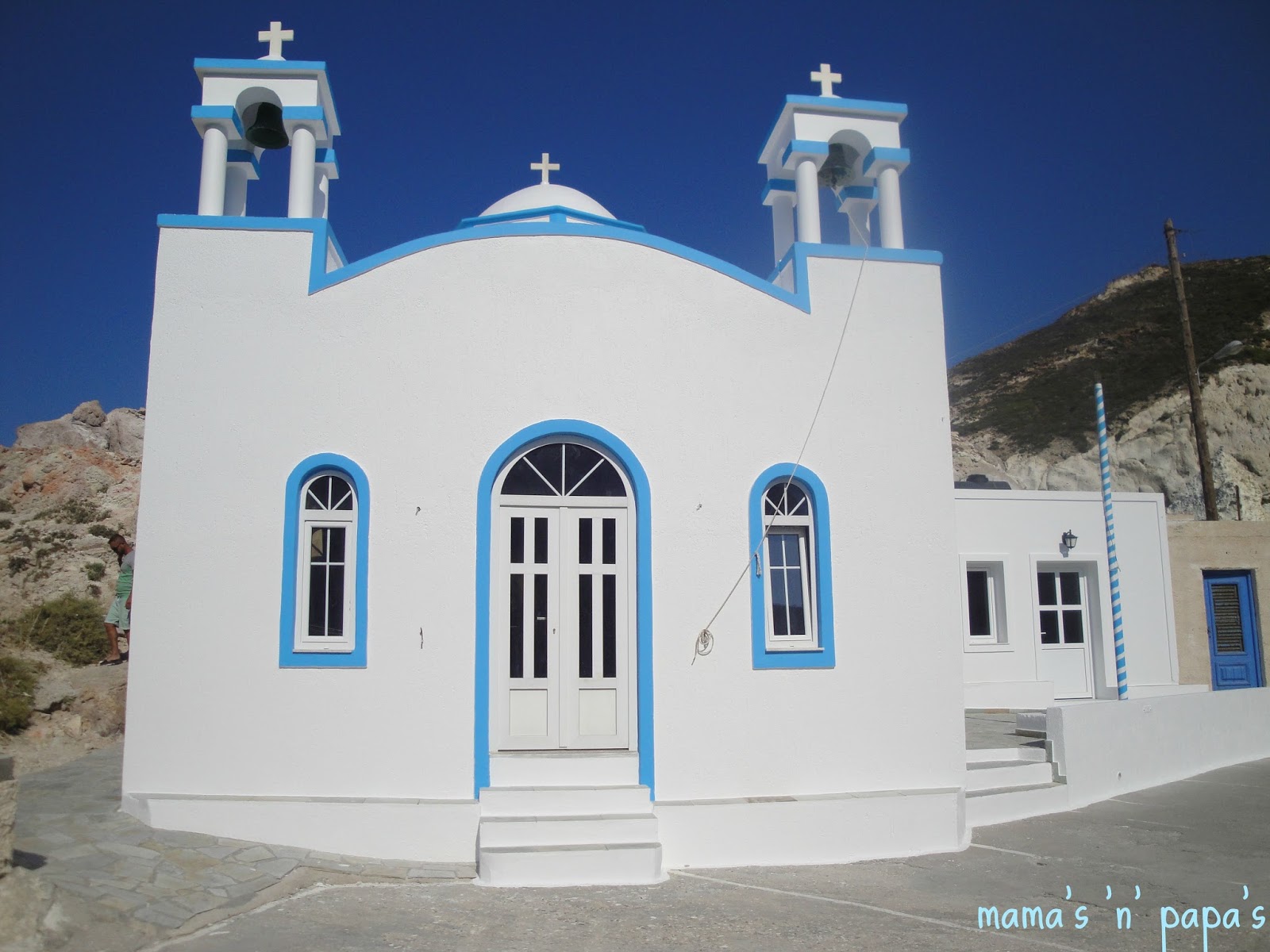 Όλα κατάλευκα και στρογγυλοποιημένα χωρίς πολλές πολλές γωνίες και με καταγάλανες συνήθως πόρτες. Έναν απλό σταυρό να στέκει γερά στο πάνω μέρος του. Χωρίς πολυελαίους και χρυσά πετραχήλια. Μονάχα οι απαραίτητες εικόνες για να προσκυνήσεις. Εμένα προσωπικά αυτό μου άρεσε πολύ.