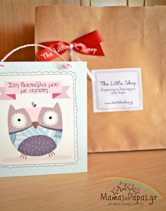 Ο Ντίνος πρόσθεσε πως η κουκουβάγια είναι η σοφή δασκάλα του! Το δώρο μας ήρθε μέσα σε υπέροχη συσκευασία δώρου φυσικά! Εδώ μπορείς να ρίξεις μία ματιά στα υπόλοιπα δώρα για την δασκάλα που διαθέτει!