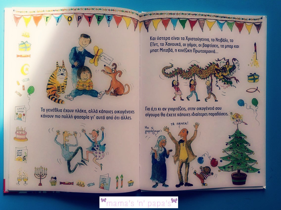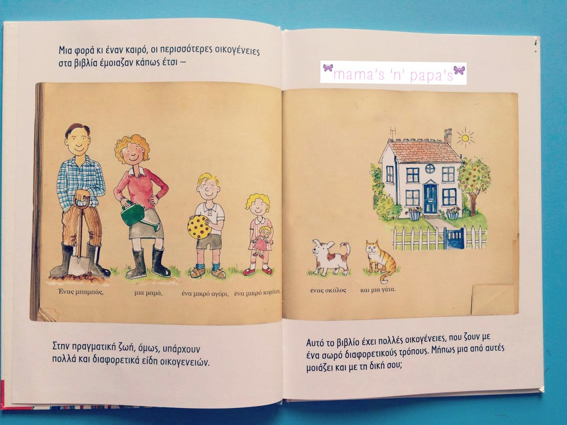 Η κάθε οικογένεια έχει το δικό της πρότυπο, την δικιά της ιδιομορφία και αυτό είναι υπέροχο! Όταν μας συνδέει αγάπη, αφοσίωση και σεβασμός μοιραζόμαστε την ίδια στέγη και τις ίδιες τις ζωές μας τότε είμαστε οικογένεια!Το βιβλίο αυτό έγινε αφορμή για υπέροχες συζητήσεις με τον Ντίνο στο σπίτι! Μιλήσαμε για τον φίλο του τον Ναμπίλ που κατάγεται από άλλη χώρα, μιλήσαμε για τον γείτονά μας τον Τ. που μεγαλώνει το παιδάκι του με περισσή φροντίδα και αγάπη μόνος του! Θυμηθήκαμε την αγαπημένη μας Σ. που ζει στο χωριό με τους παππούδες της γιατί οι γονείς της έπρεπε να δουλέψουν στο εξωτερικό για λίγο διάστημα! Γνωρίσαμε ήθη και έθιμα που δεν γιορτάζουμε εμείς στη χώρα μας και χαρήκαμε πολύ γιατί συλλέξαμε νέες πληροφορίες!!