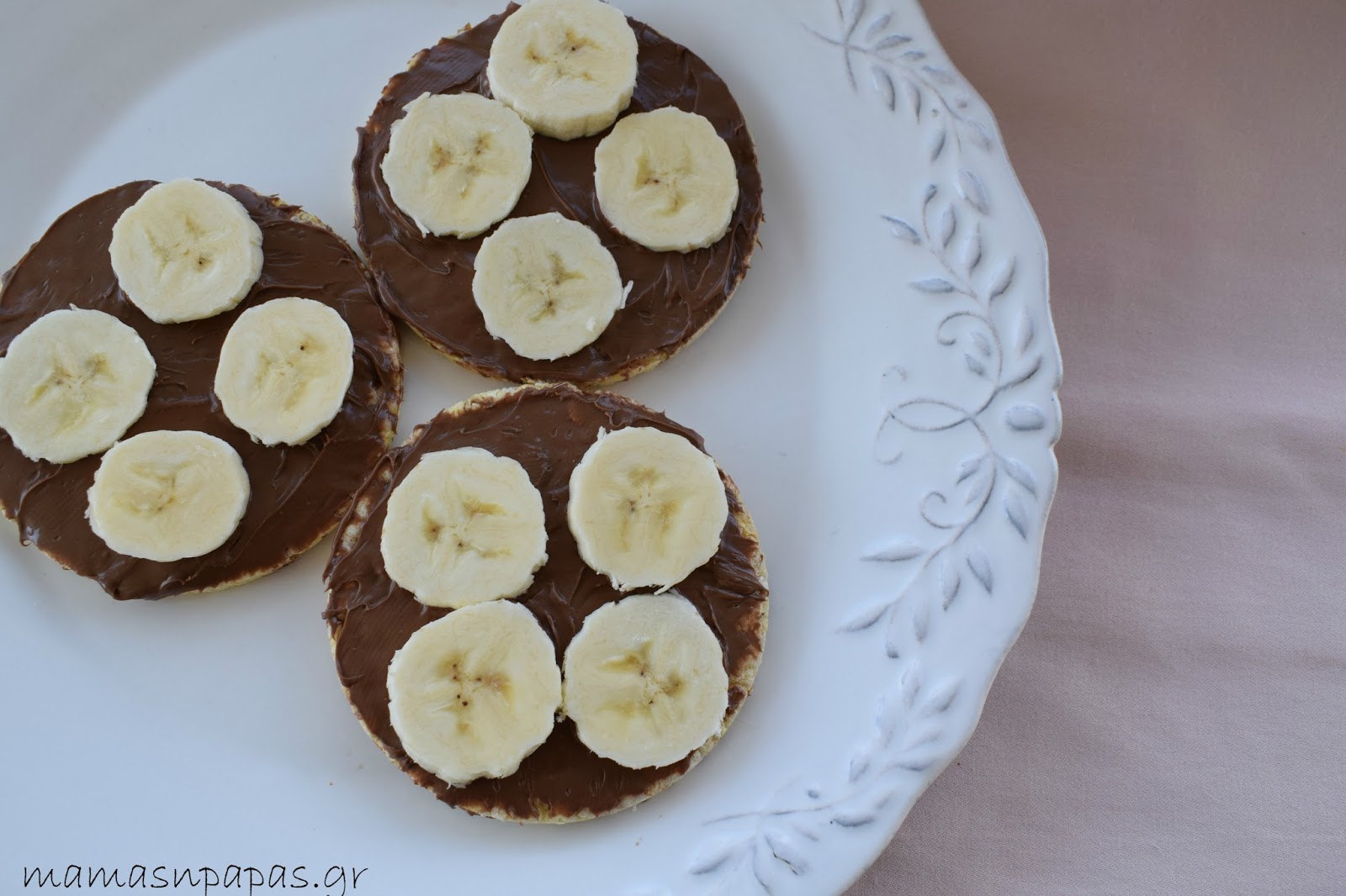 Ρυζογκοφρέτα με πραλίνα φουντουκιού και ροδέλες μπανάνα! Η Θέμις στο βιβλίο της το συγκεκριμένο σνακ το είχε σαν sandwich με δύο ρυζογκοφρέτες! Εγώ θεώρησα και με μία ήταν καλυμμένο το πιτσιρίκι μου! Ήξερα άλλωστε πως θα μου ζητήσει και δεύτερη σίγουρα!