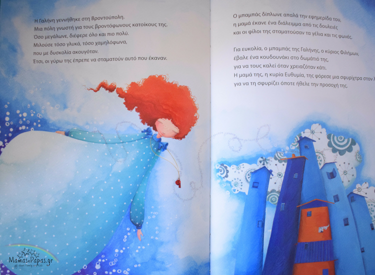 Η Γαλήνη κατάφερε να κάνει όλους τους ανθρώπους που την συναντούσαν να μιλούν και εκείνοι χαμηλόφωνα όταν ήταν δίπλα τους! Ακόμη και στην αγορά όταν κατέβαινε το κορίτσι επικρατούσε τόση ησυχία που μπερδευόσουν και νόμιζες πως βρισκόσουν στην βιβλιοθήκη της πόλης! Ο Βασιλιάς, πάλι, που ζούσε στην άλλη άκρη της πόλης συνέχιζε να μιλά ουρλιάζοντας στους αυλικούς και σκούζοντας στους υπηρέτες!Ώσπου μια μέρα δεν άντεχε άλλο και από τις φωνές είχε μονίμως πονοκέφαλο! Ποιο λες να ήταν το γιατρικό του τελικά?.Θα σε αφήσω να το ανακαλύψεις παρέα με το μικρό σου!